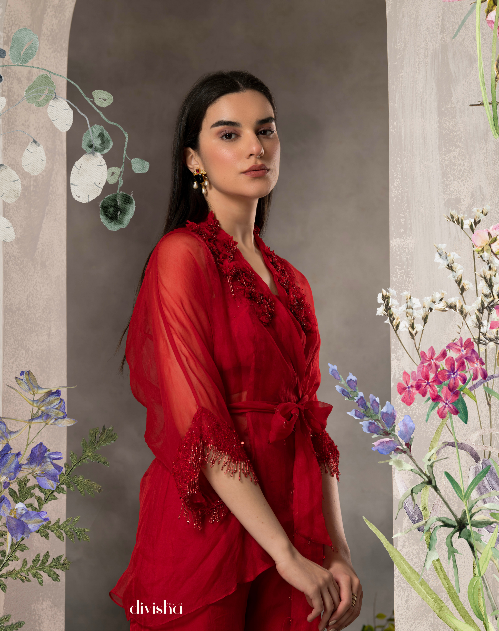 Red Silk Organza, Chiffon 3d Bloom Crest Wrap Tunic And Sharara Pant Set