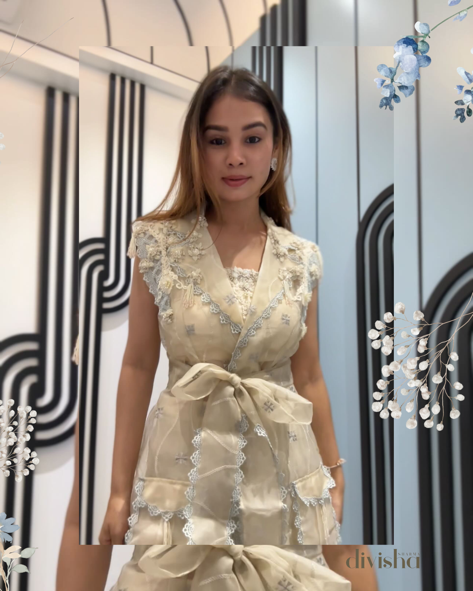 Powder blue ivory sheer organza top with ombré bell bottoms and a bustier with an attached belt is a versatile perfect pick for any special occasion to ace that uniquely classy outfit look!