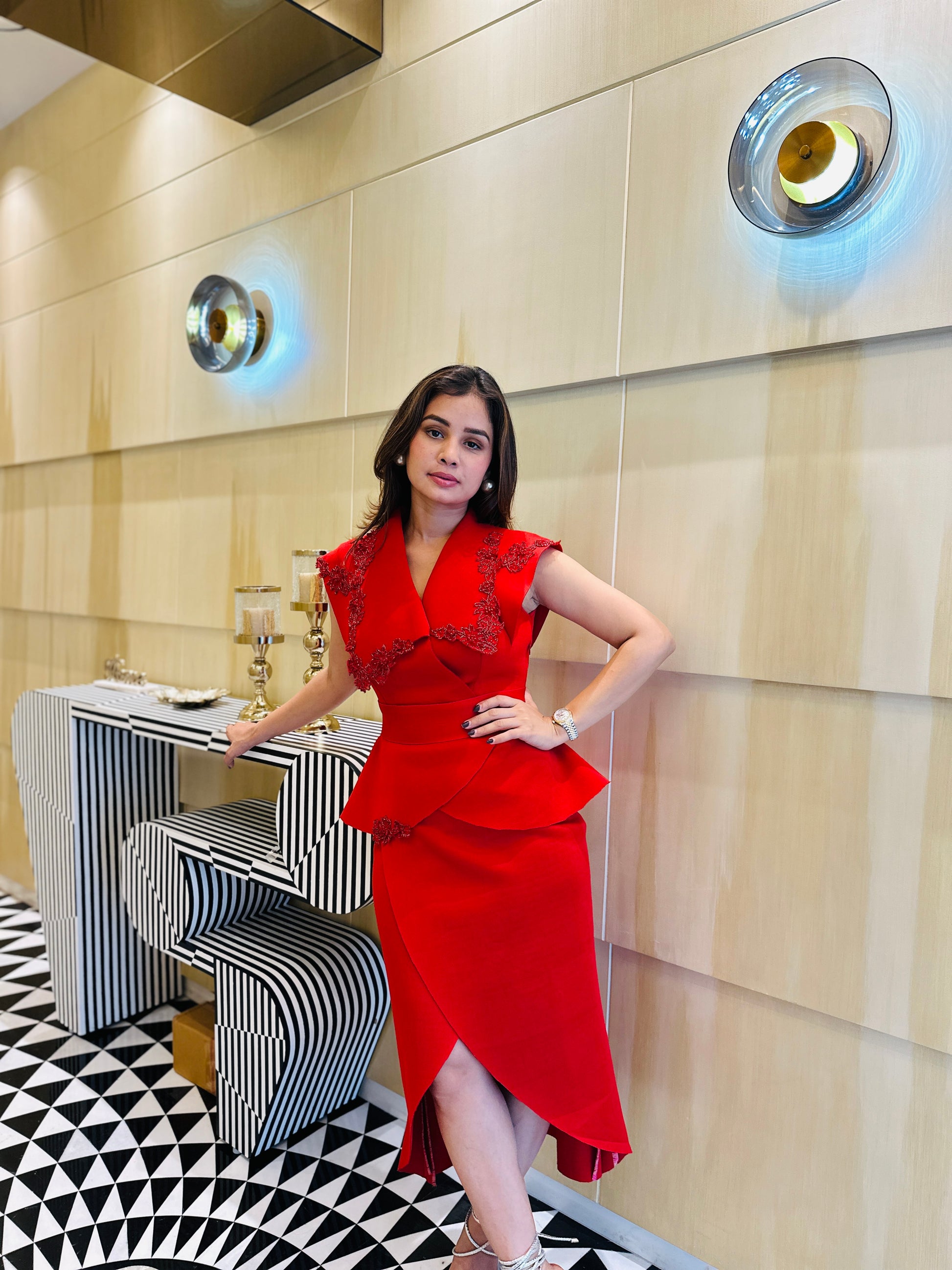 Solene (skirt top & belt set) a combination of a structured silhouette with tonal hand embroidered details on exaggerated collar in scarlet red is perfect for those cocktail after party or a birthday bash