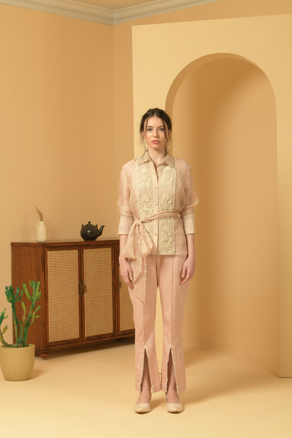 Powder pink silk organza shirt with intricate zardozi embroidered yoke and attached tie belt with pearl edging ,is paired with front slit straight pants with beautiful pocket and slit edge detail.